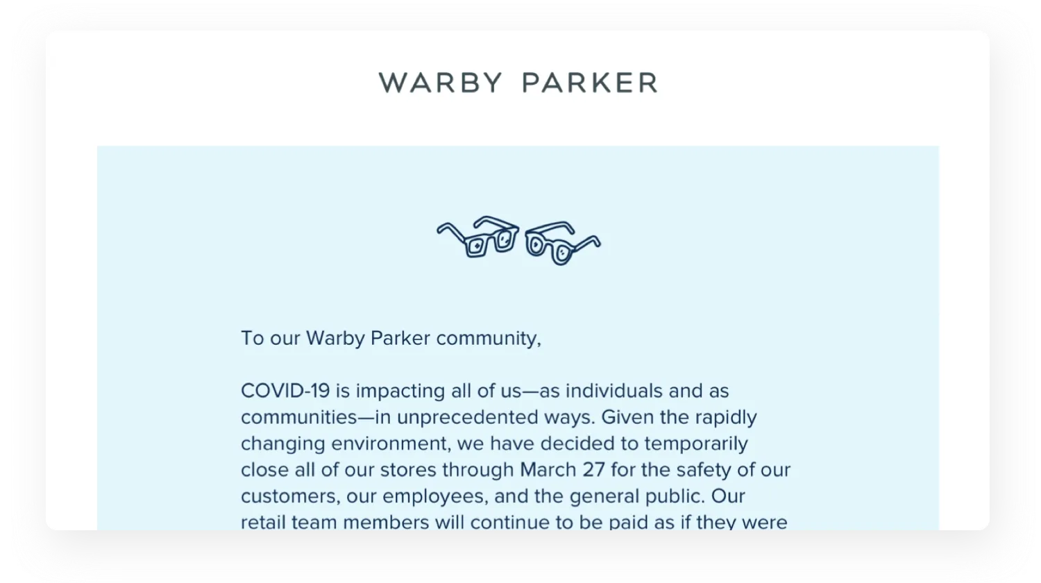 - Commitment that they are upping frequency: Warby Parker emphasizes its commitment to helping its customers get through this difficult time with exceptional customer service and digital try-on tools and programs.