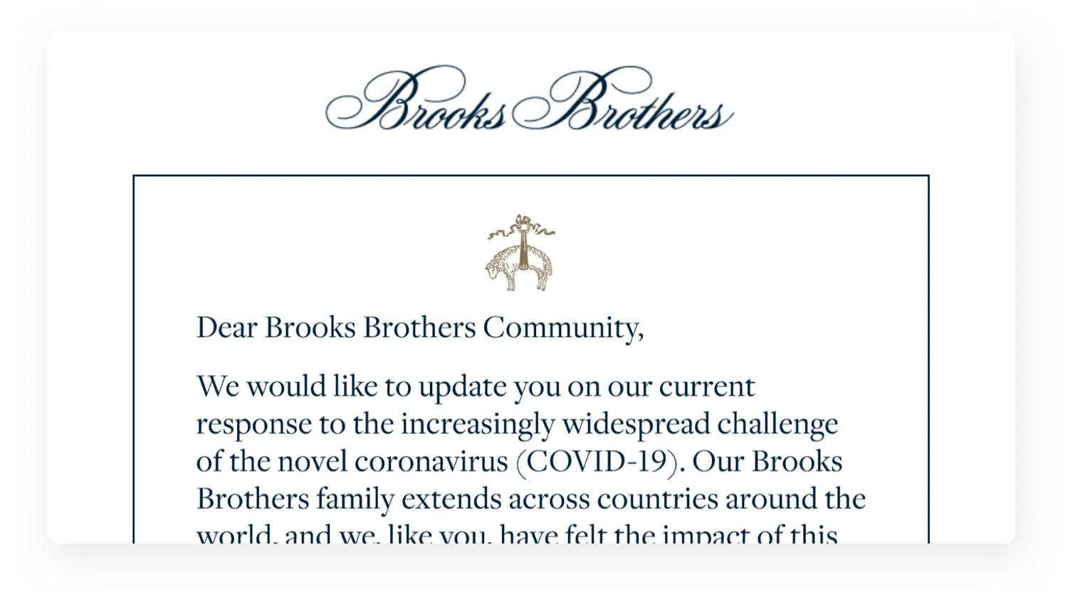 - Trust and confidence: Because Brooks Brothers has been operating for more than 200 years, it has “been witness to many of history’s greatest challenges.” This reminder gives readers a sense of relief and confidence in the brand’s ability to survive this disruption.