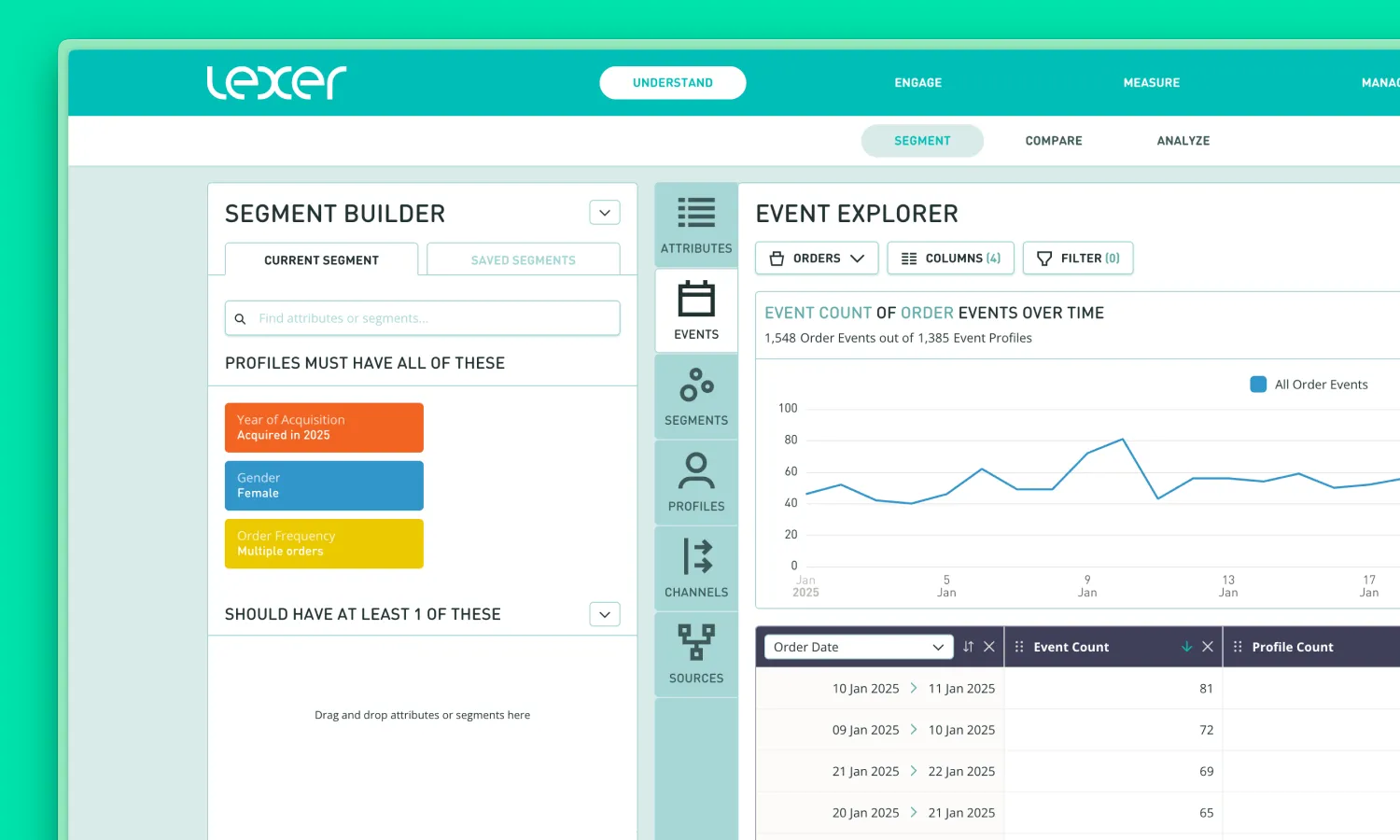- Ask the right questions – start with your existing Lexer customer segments. Whether you’re looking at first-time buyers, loyal repeat customers, or seasonal campaign buyers, Event Explorer instantly pulls relevant results.