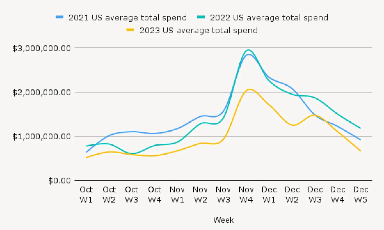 In 2023, average sales dropped by 29% YoY. BFCM is still the primary driver for holiday sales. Early October sales were substantially lower compared to both 2022 and 2021. This could suggest reduced consumer confidence, and more savvy shoppers waiting for discounts.