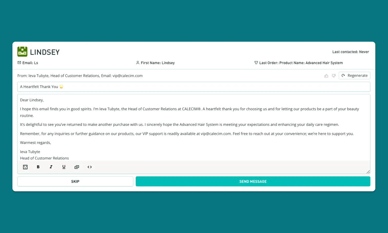 For high-value or inactive customers showing renewed interest, CALECIM ® used Lexer’s AI tools to craft personalized emails from the Head of Customer Relations. These highly tailored personalized messages referenced customer-specific purchase data and were sent to 1,852 customers, achieving impressive conversion rates of 5.89%.