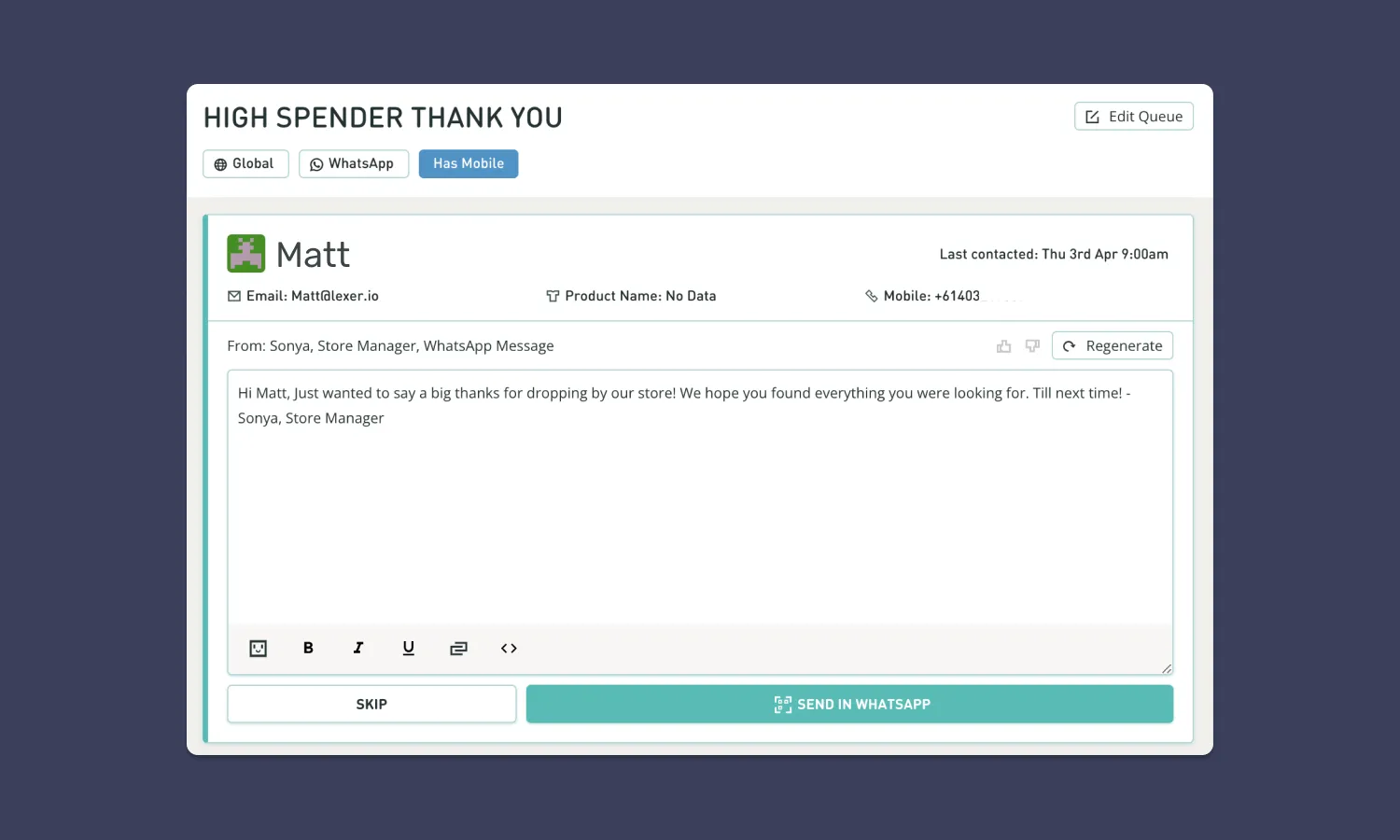 Getting started is simple. First, using your Lexer Segments create a queue of customers you would like to target. Select WhatsApp as the channel. Then use Lexi AI to help generate highly personalized, ready-to-send messages tailored for that segment.
