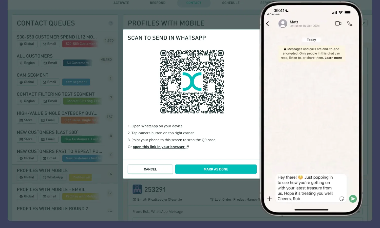 When it’s time to send, open Lexer Contact and select your WhatsApp queue. Review the Lexi-generated messages, scan the QR code with your phone to open WhatsApp, the message will automatically pre-populate, then all you need to do is hit send!