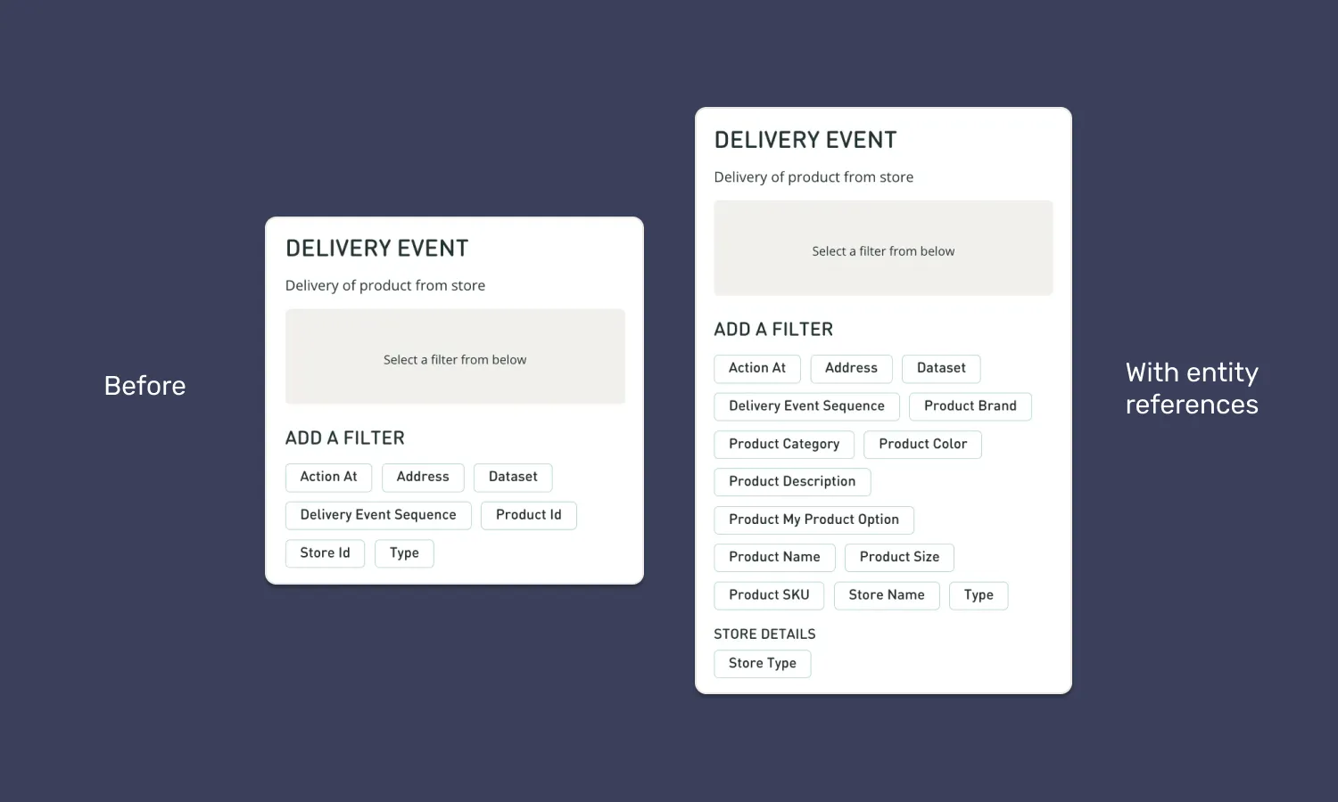 Event entities references bring structure and efficiency by linking events to related objects—like products, or stores—without duplication. This makes searching, analyzing, and future-proofing your data faster, cleaner, and more consistent.