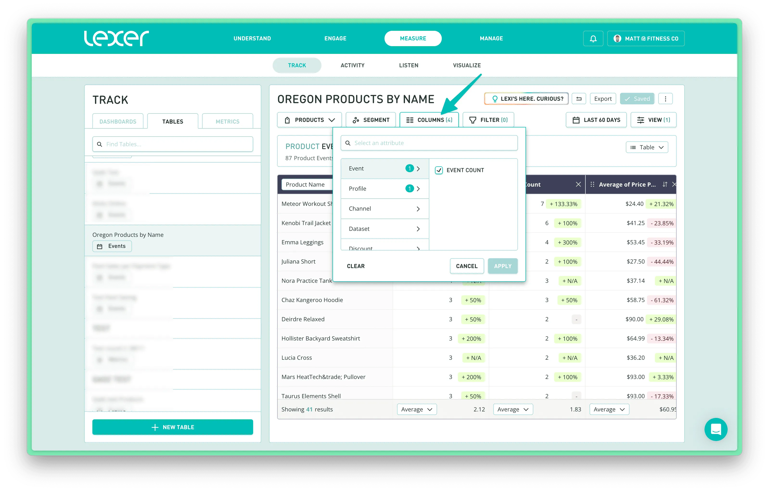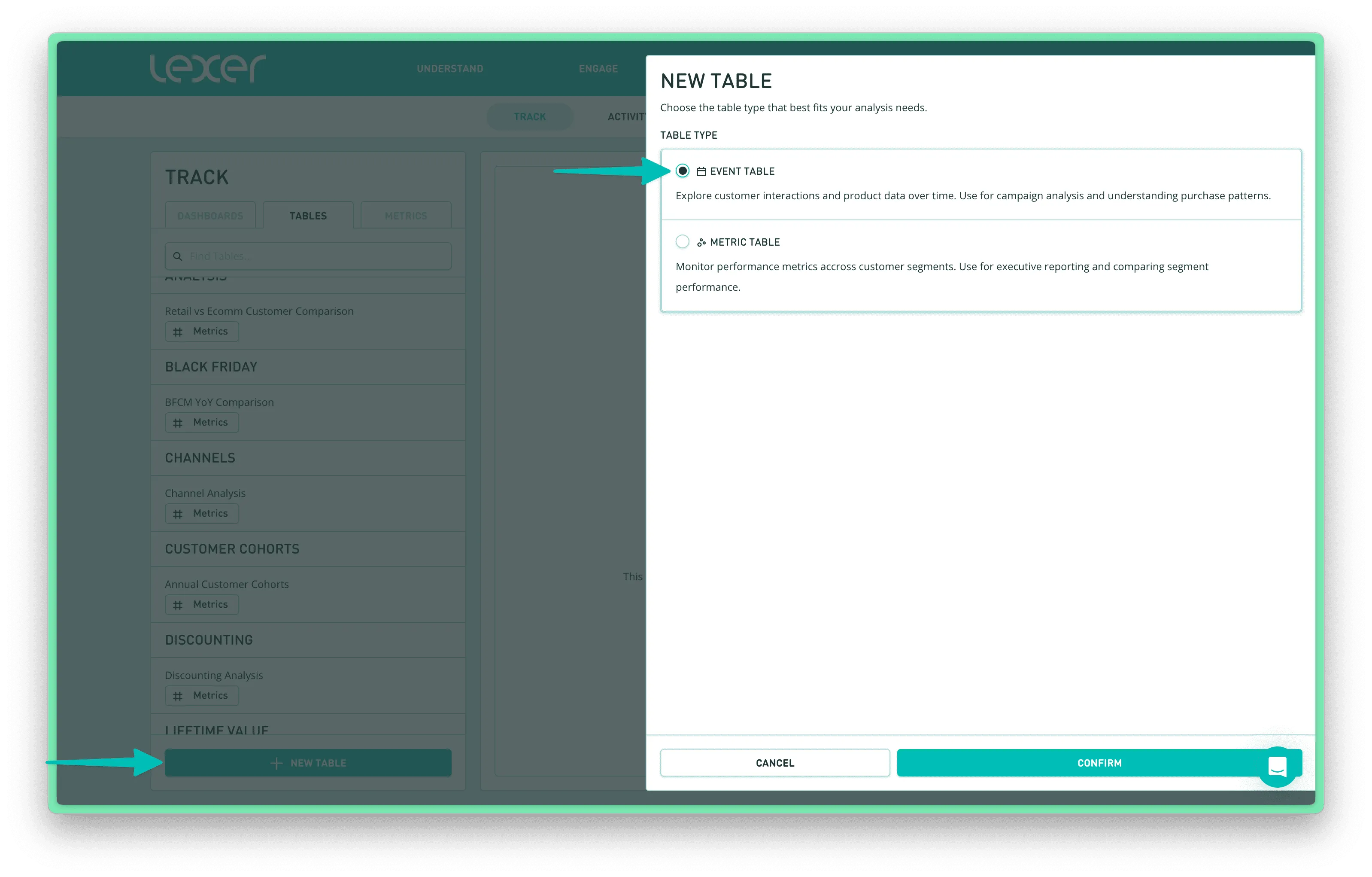 Event Tables live in Lexer Track, right alongside your Metric Tables, with a few key differences: